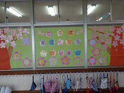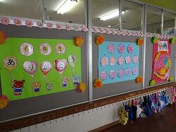 順にあおぞら教室から5年生までの廊下です。3年生のは6年生の似顔絵などが貼ってあります。4年生のは、一人一人の卒業生へのコメントが入っており、5年生は、6年生一人ずつに感謝の言葉が入ったカードを掲示しています。