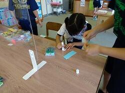 乾電池を使ってプロペラを回す装置を使って電池の配列や回路の違いについて調べていました。