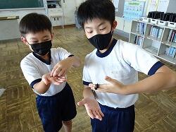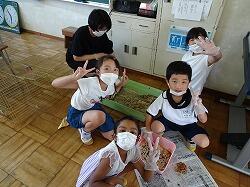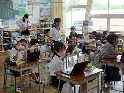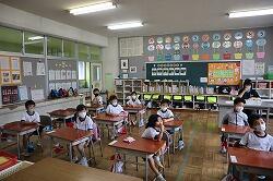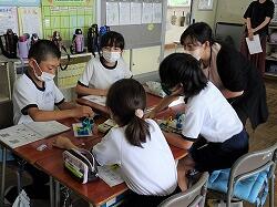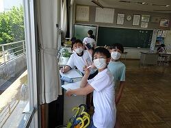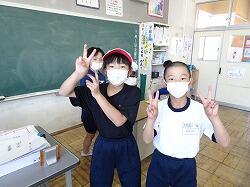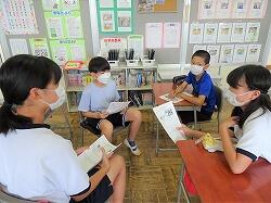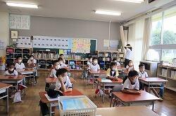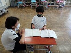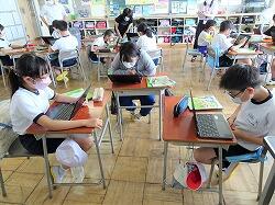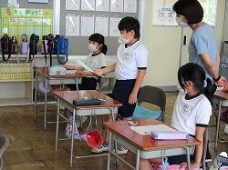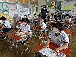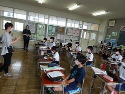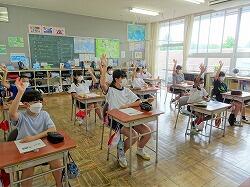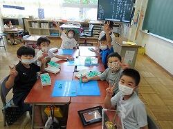今日も静かに学習していました。1・2年生は、終わった子やわからない子が積極的に手を挙げていました。ムシムシしているので水分等は合間に自由にとっています。休憩時間は友達と楽しそうに話したり、ウサギなど生き物の様子を見たりしています。
