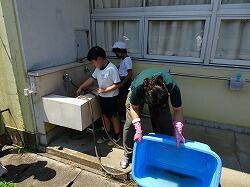 最後の写真は洗濯したものを振り回していますが、しわを伸ばしているところです。しっかり伸ばして干すための作業です。児童は、洗濯というのは、洗濯機でスイッチ一つですると思っていたでしょう。貴重な体験かなと思います。