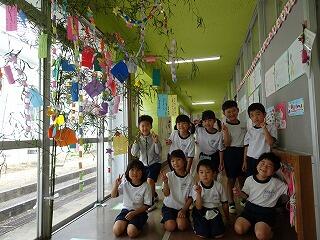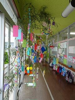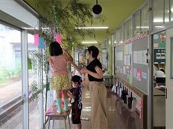 七夕に備えて笹飾りをつくりました。笹竹も1年生の保護者の方にもってきていただいたものです。願い事がかなうといいですね。