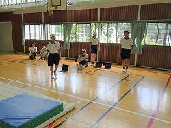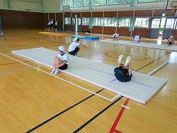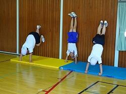 体育のマット運動です。時々給水タイムを取りながら、家の人の前で技を披露していました。