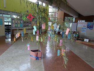 広場にあります。児童や先生方が短冊をかけています。「コロナが終わりますように」、「夏休みお出かけできますように」、「ほしいものが手に入りますように」「映画が見られますように」などに加えて、「好きな人と一緒にいられますように」というおませさんの願いもありました。1人で何枚も書いている欲張りさんもいました。