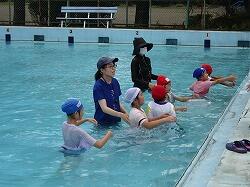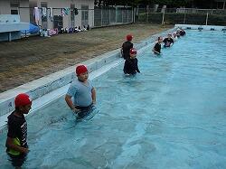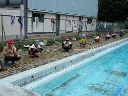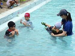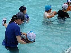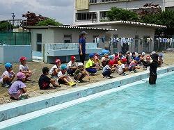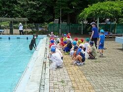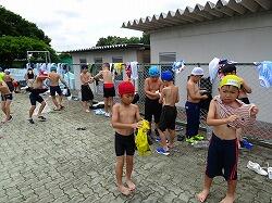 また、服を脱いで、よく絞ってを行っていましたが、それもくっついた衣服が脱げなくて苦労していました。最後に少しだけ自由に泳ぐ(遊ぶ)時間をもらえたので、嬉しそうに泳いでいました。最後に、「一番大切なことは川や用水などに落ちないこと、家の人と一緒でなければ水辺で遊ばないように」という話を聞いていました。