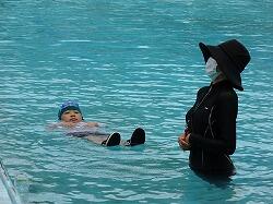 水に入ると「重ーい」「ジャンプできない」などの声が聞こえました。「背浮き」はなかなか難しいのですが、中にはコツをつかんですぐできるようになっている児童もいました。