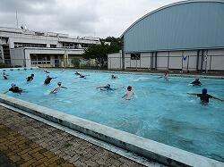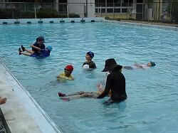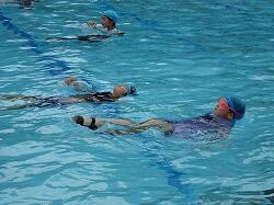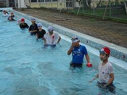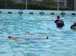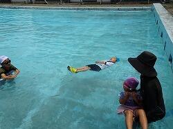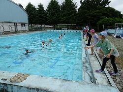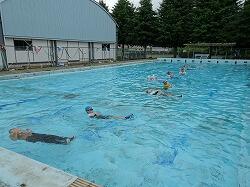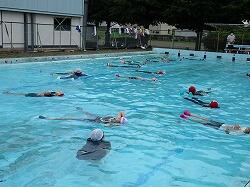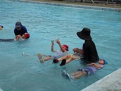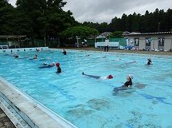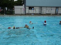 3・4年生の様子です。川にはまって、岸辺の人がペットボトルを投げてあげるところから行っていました。さすがに背浮きができる児童が多いようです(半分ぐらいでしょうか)。