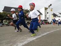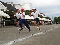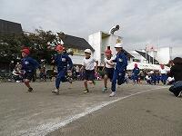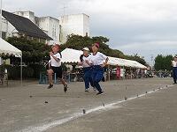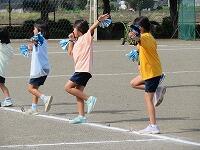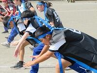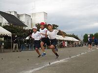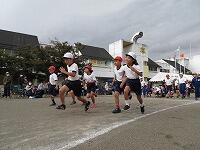 次の種目は、「みんな輝く全校リレー」です。みんなで一生懸命、バトンをつなぐことができました。全校リレーの優勝は、白組でした。おめでとうございます。