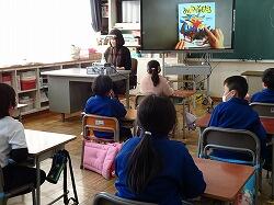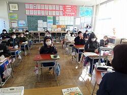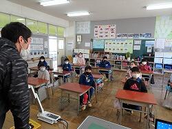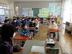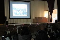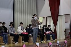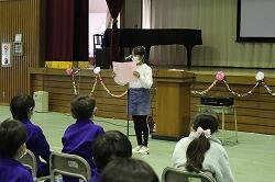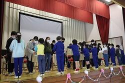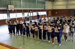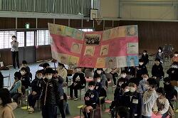 次に先生が、「なんでお饅頭が出るんだっけ」と聞いたら、一瞬「しーん」。こらこらという感じです。そのうち少しずつ「学校の誕生日」とか、「3月6日」という返事が聞こえてきました。「途中で食べたりしないで、家の人に見せてから食べてね」とお願いしましたが、大丈夫だったでしょうか。4~6年の高学年にも同じような質問をしましたが、こちらは「148年目の誕生日」とか「創立記念日」とすぐ返事が返ってきました。さすがです。