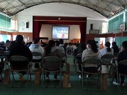 そのあと6年生の小学校時代のアルバム鑑賞して、教頭先生のお話のあと映画鑑賞になりました。6年生もステージの下に降りて一緒に鑑賞しました。