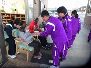 新型コロナウイルス感染症の流行前に行っていた介護福祉施設との交流活動。現在は対面での直接的な交流がなかなかできない状況です。そこで、生徒会の環境福祉委員による「お花のプレゼント」を行いました。夕方の肌寒い時間でしたが、玄関前でお花をお渡しすることできました。手書きのメッセージを添えたきれいな鉢植えと一緒に、生徒からの「笑顔とやさしさ」を受け取っていただいたと感じています。風邪などに注意して、これからもお元気でお過ごしください。