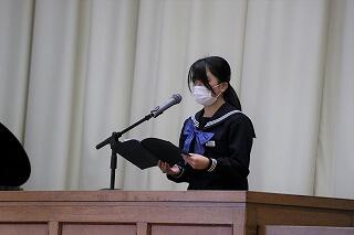図書館司書さんから、3年間使用した図書カードとメッセージつきの貸し出し履歴が手渡されました。加えて、吉田松陰の「飛耳長目」のお話から、たくさんの情報が錯綜する社会で、遠くの事をよく見聞きする耳や目で敏感に観察して得た正確な情報をもとに行動してほしいとの言葉が贈られました。すると今度は生徒たちから、「図書室をきれいに整えていただいたり、素敵な本を紹介していただいたり、3年間ありがとうございました」とお礼の色紙が贈られました。