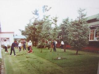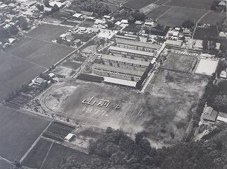 ※昭和50年ごろの写真より。木造校舎で中庭があり、きれいに整備されていました。私は「第26代」校長となります。正面入り口の松の木は、現存する本校のシンボルでもあります。