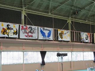 体育館側面に掲示された各学級の「学級旗」