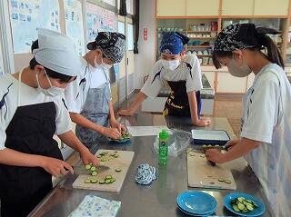 1年生の家庭科の授業で、食生活に関する学習として調理実習を行いました。今回はきゅうりの輪切りです。安全面や衛生面を考慮し、最後はサラダにして口の中へ。いつも調理していただいている方々への気持ちも大切にしながら…。