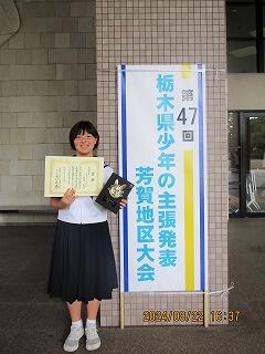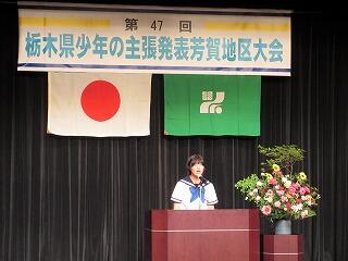 栃木県少年の主張発表芳賀地区大会が真岡いちごホールで開催されました。中学生が日常生活の中で感じていることや考えていることを芳賀郡市内の代表16名が発表しました。本校からは3年生女子生徒が参加し「自分らしく暮らせる社会へ」と題して、急速に進んでいる高齢社会の中で誰にでも可能性のある認知症について、実体験とともに自分の考えを堂々と発表しました。胸の内から湧き出る真剣な思いは、その会場全体にしっかりと伝わっていました。