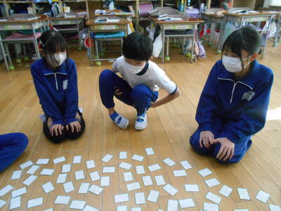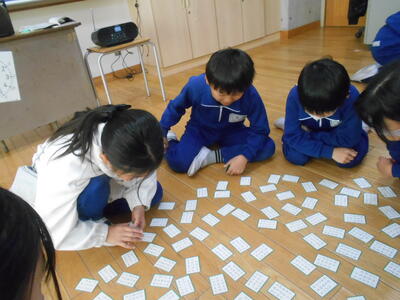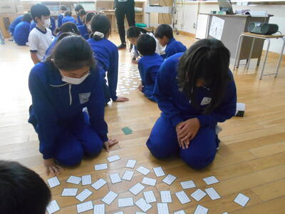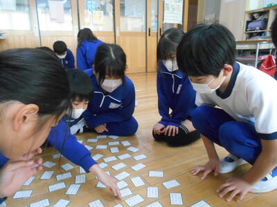 今日は4年2組の国語の授業にお邪魔しました。今日の授業は単元名「百人一首に親しもう」。ちょうど百人一首を使ってかるた遊びをしていました。