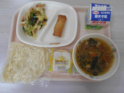 今日の給食は、しょうゆラーメン、春巻き、わかめサラダ、レモンタルトでした。