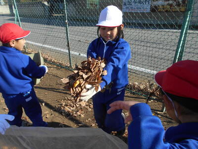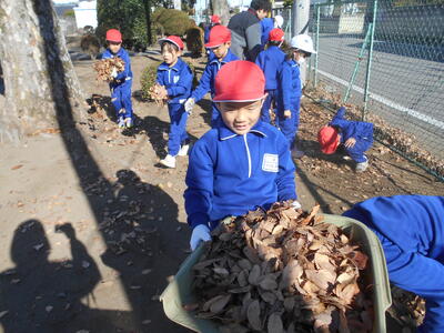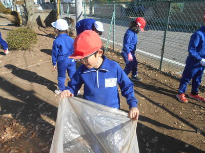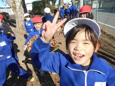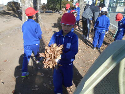 6年生が箒で掃いて落ち葉を集め、1年生はその葉を運んでビニール袋に詰めて、あっという間にきれいになりました。