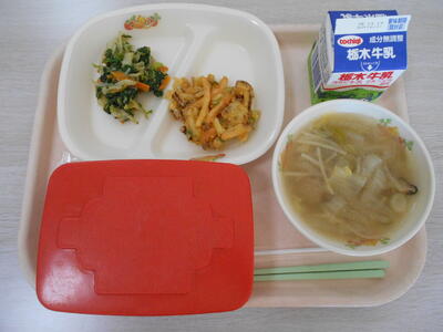 今日の給食は、とり肉のから揚げ、キャベツの塩昆布和え、けんちん汁でした。