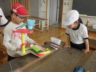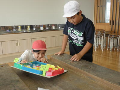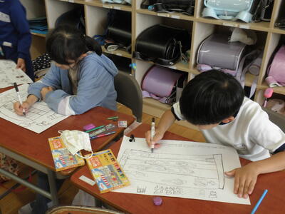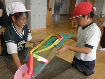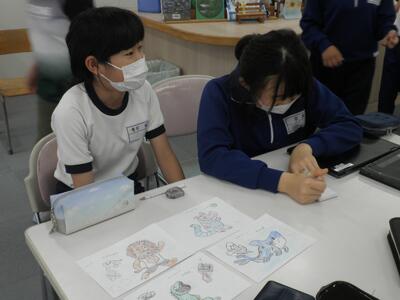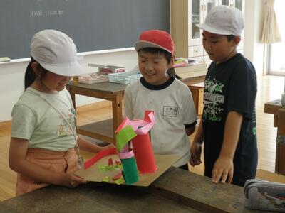 子どもたちは「すごーい」「難しい!」などど言いながら、友達の作品の良さや面白さを見つけ合っている様子でした。
