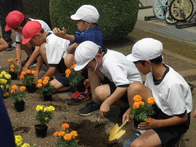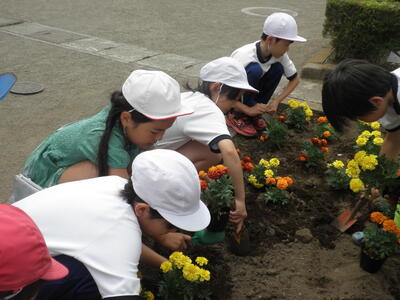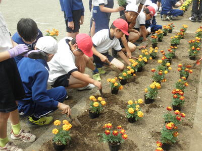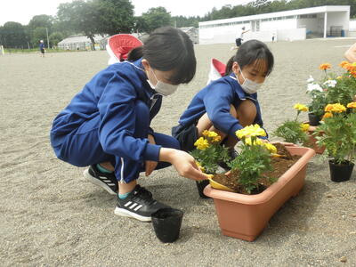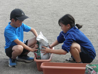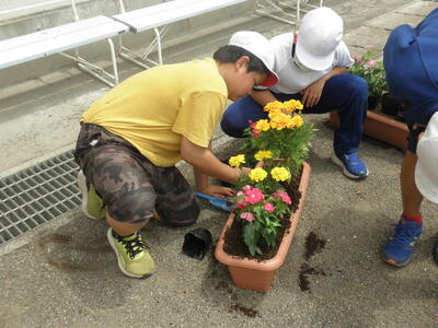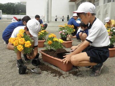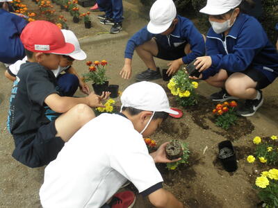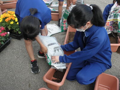 今日はアグリ活動がありました。今日は学級ごとに花壇やプランターへ花植えを行いました。