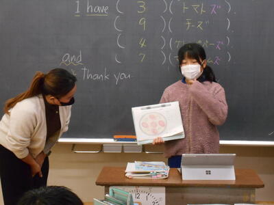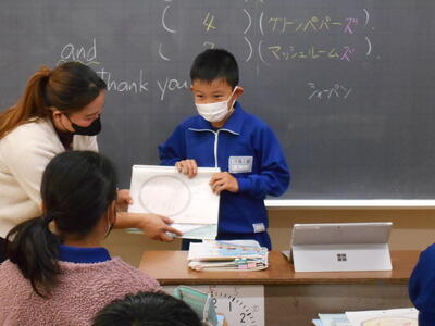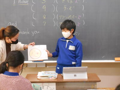 4年2組の外国語では、自分で考えたオリジナルピザについての紹介をしていました。