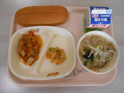 今日の給食はベトナム料理、コッペパンのバインミー、バインミーの具はとり肉の炒め物とベトナム風酢の物、そして、フォーガーでした。