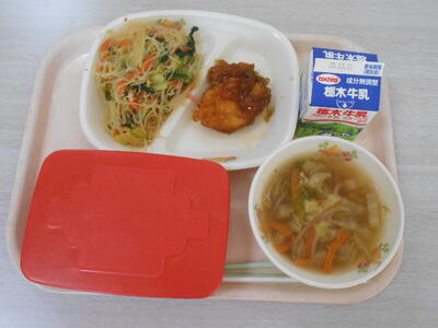 今日の給食は、油淋鶏、春雨の中華和え、ワンタンスープでした。