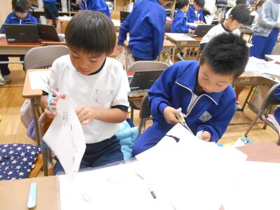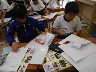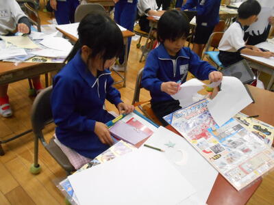 いよいよ3年生は版画の制作がスタートしました。今日は下絵作りで、形を切り取り画用紙に貼る作業を進めていました。